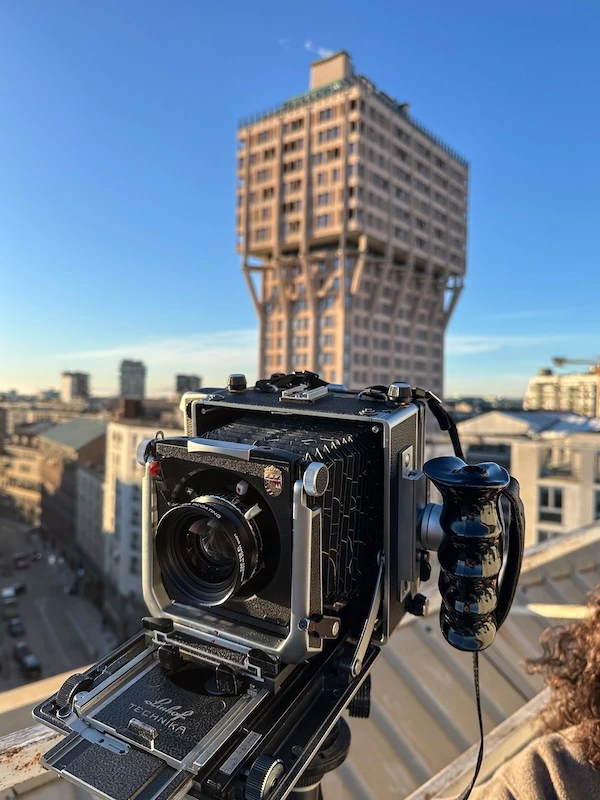 L’immagine, esemplificativa dello stile fotografico di Davide Canella, è il risultato di un equilibrio tra tre elementi portanti: la figura umana in primo piano, gli edifici alle sue spalle e l’ambiente che li contiene. Le architetture qui rappresentate sono molteplici e molto diverse tra loro per stile e periodo. Dalla costruenda nuova Torre Faro A2A, un tronco di cono alto oltre 140 metri progettato da ACPV Architects e visibile oltre Fondazione Prada, agli edifici museali che compongono il polo della stessa Fondazione, con i magazzini bassi della ex distilleria dei primi del Novecento, l’iconico edificio “Torre” rivestito in vernice in oro e la torre in cemento bianco di Red Koolhaas del 2018. L’uso del bianco e nero toglie la distrazione del colore che caratterizza la maggior parte degli stabili ritratti e aiuta l’occhio dell’osservatore a concentrarsi sulla galleria dei volumi e delle diverse forme delle architetture mentre la presenza umana in primo piano incerniera e connette l’ambiente in cui sono collocate le costruzioni.