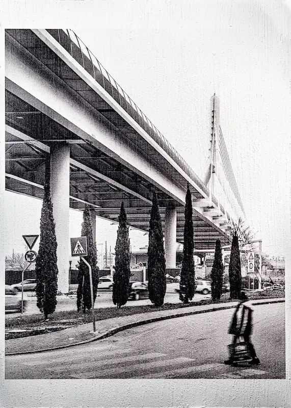 Scattata a partire dall’ingresso del cimitero storico, la fotografia accompagna lo sguardo dell’osservatore che dal basso della strada sale seguendo la verticalizzazione suggerita dai piloni e dai cipressi per volgersi verso gli stralli del Ponte Adriano, collegamento viario tra la Fiera del Levante e il quartiere popolare di Poggifranco. L’attenzione è tutta dedicata alle strutture che sorreggono il ponte, le coste e i triangoli che ne compongono lo scheletro sotterraneo insieme alle colonne. Il ponte non ha una meta e si perde nel cielo bianco dell’orizzonte mentre la figura umana in primo piano funge nuovamente da raccordo tra gli elementi richiamando il precedente scatto alla Fondazione Prada così come gli elementi triangolari e le coste rimandano invece al Costato di Torre Velasca.