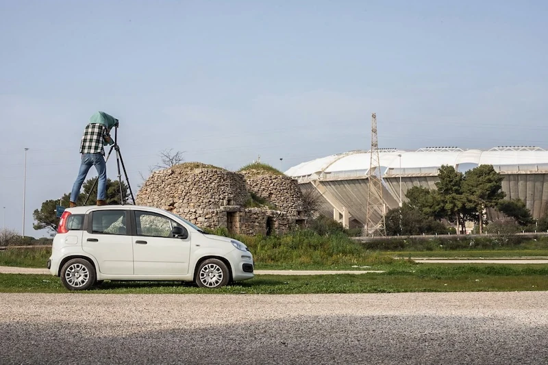 Lo stadio di San Nicola a Bari, opera di Renzo Piano, fa da sfondo alle spoglie di un grande trullo diroccato, elemento connotante la terra di Puglia che nel tempo ha abbracciato nuovi stili di vita lasciando il passato al suo destino. Come in altri scatti, l’immagine si compone usando ambiente, cemento e figura umana, i tre elementi classici della fotografia di Canella. La presenza pesante, quasi teatrale del trullo è bilanciata ancora una volta dall’uomo in primo piano che funge da raccordo tra il grande stadio di sfondo e il rudere in primo piano nello scatto. Il trullo è dominato dallo stadio, come uno spazio privato che ha ceduto il passo a un luogo di comunità moderno e corale.